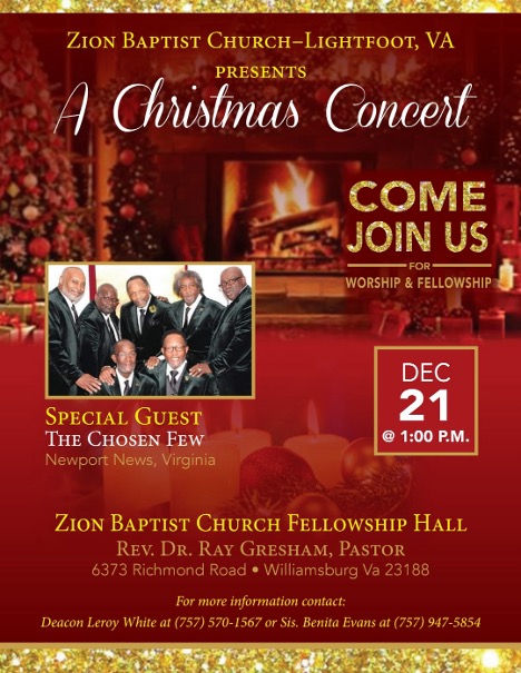 December 21, 2025 – Pastor Gresham and the Zion Baptist Church Veterans Christmas Drive titled, “Operation Pride and Joy” will be Sunday, December 21, 2025, at 1:00 p.m. There will be a concert, dinner will be served and Santa Elf’s will be distributing gifts for the children.